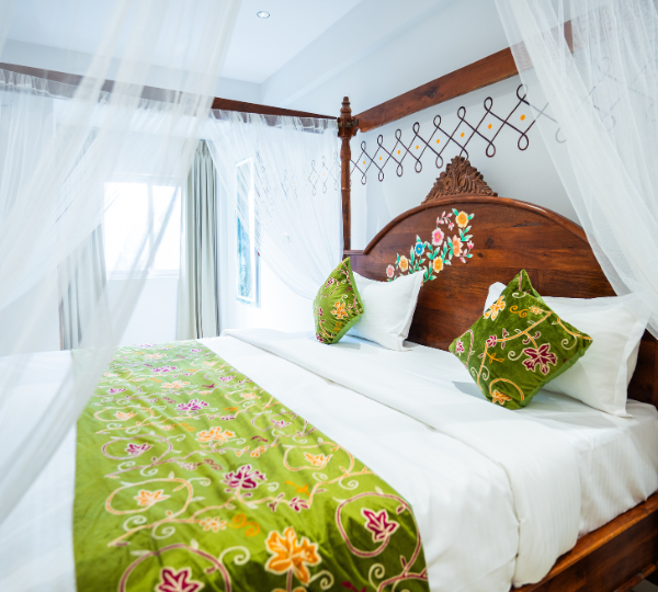 An elegant and spacious room featuring a plush king-size bed, air-conditioning, high-speed Wi-Fi, smart TV with satellite channels, work desk, mini refrigerator, wardrobe, tea/coffee maker, and a private bathroom with premium amenities — ideal for couples, families, and business travelers.