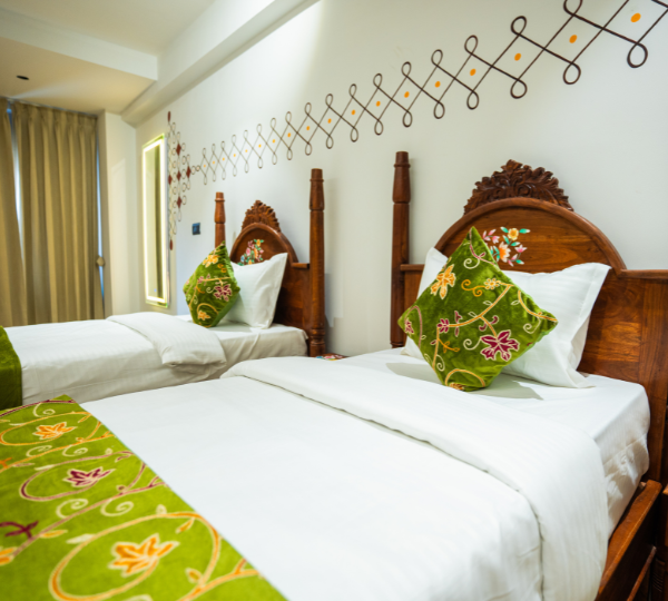 A comfortable and well-designed room featuring twin beds, modern air-conditioning, high-speed Wi-Fi, a smart TV with satellite channels, work desk, mini refrigerator, wardrobe, tea/coffee maker, and a private bathroom with complimentary toiletries — perfect for business travelers and short city stays.
